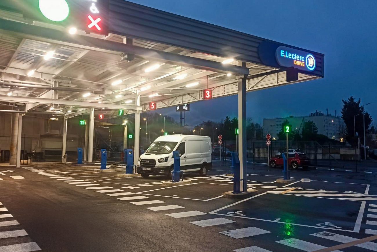Le drive E.Leclerc d’Éragny s’inscrit dans une nouvelle génération de sites, alliant esthétique moderne et organisation pensée pour gérer un fort volume de clients. Sa configuration à double rangée permet d’optimiser l’accueil tout en garantissant une circulation fluide.